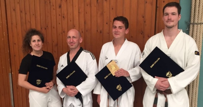/in Alle, PrüfungKlasse! Am 16.07.2016 unterzogen sich gleich vier Taekwondoin des CGH in Rodgau-Jügesheim der Dan-Prüfung, also der Prüfung zum sogenannten und oft zitierten „Schwarzen-Gürtel“ oder auch schlicht „Schwarzgurt“.